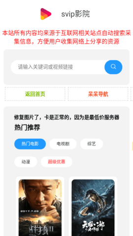 SVIP影院是一款优秀的观影软件,拥有独家片源和自家服务器,播放影片极速流畅。支持弹幕交流,让用户可以与其他观影者互动,增加观影趣味性。提供最新热门的电视剧、电影、综艺节目等内容,用户可随时随地观看更新迅速的影视作品。