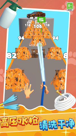 2、独特的压力清洗模式,玩家可以使用高压水枪清洗各种物体,享受流畅的操作体验和解压的快感。