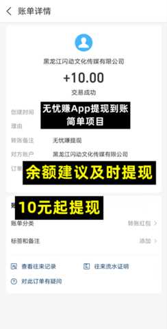 2、快速提现机制:无忧赚允许用户在收益达到10元时即可提现,且提现通常在24小时内到账,确保用户的资金流动性。